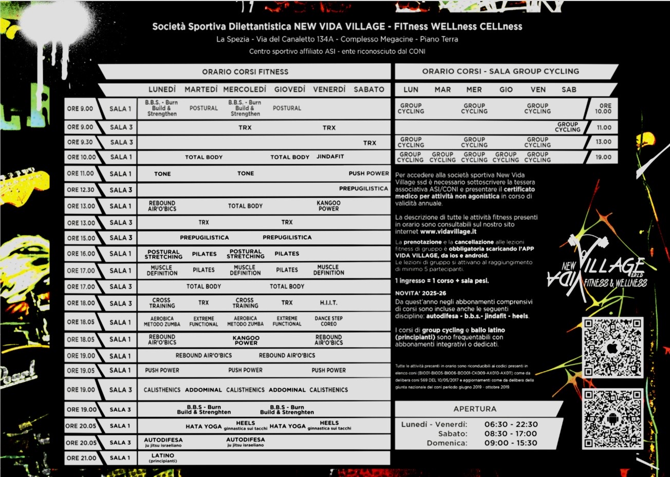 New Vida Village S.r.l.d. a La Spezia è un'ottima scelta per gli appassionati di fitness e proprio per questo rappresentiamo un importante punto di riferimento in città. La nostra palestra fitness è moderna, spaziosa e accogliente, con un ampio parcheggio e una posizione strategica a pochi minuti dal centro. Oltre a offrire una vasta gamma di corsi, New Vida Village S.r.l.d.è anche un luogo di incontro e di scoperta per coloro che cercano di migliorare la propria autostima e socialità. Ti invitiamo a scoprire tutti i nostri corsi e a diventare nostro socio per iniziare o continuare il tuo percorso di fitness.